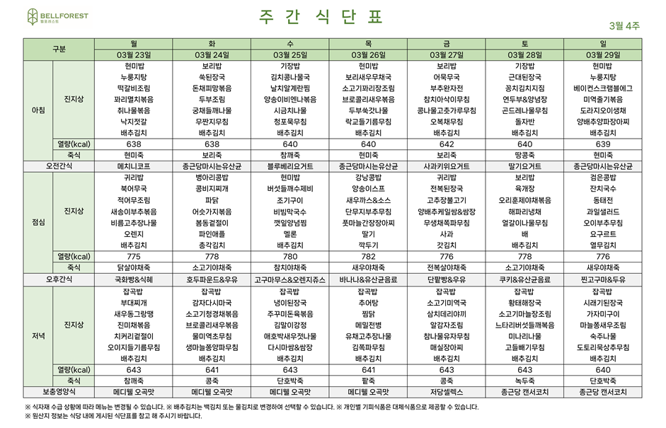 주간식단표 (2026.03.23~2026.03.29)