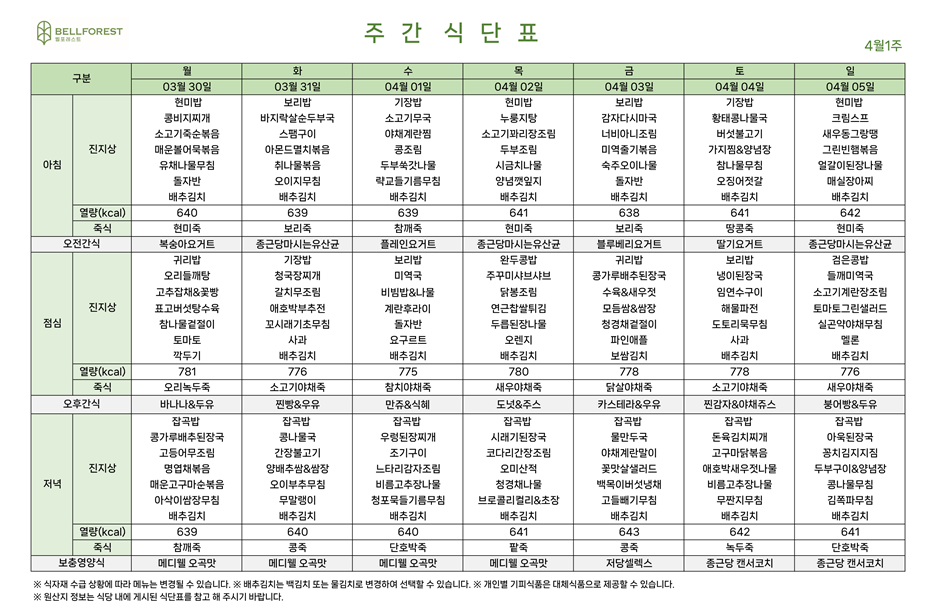 주간식단표 (2026.03.30~2026.04.05)