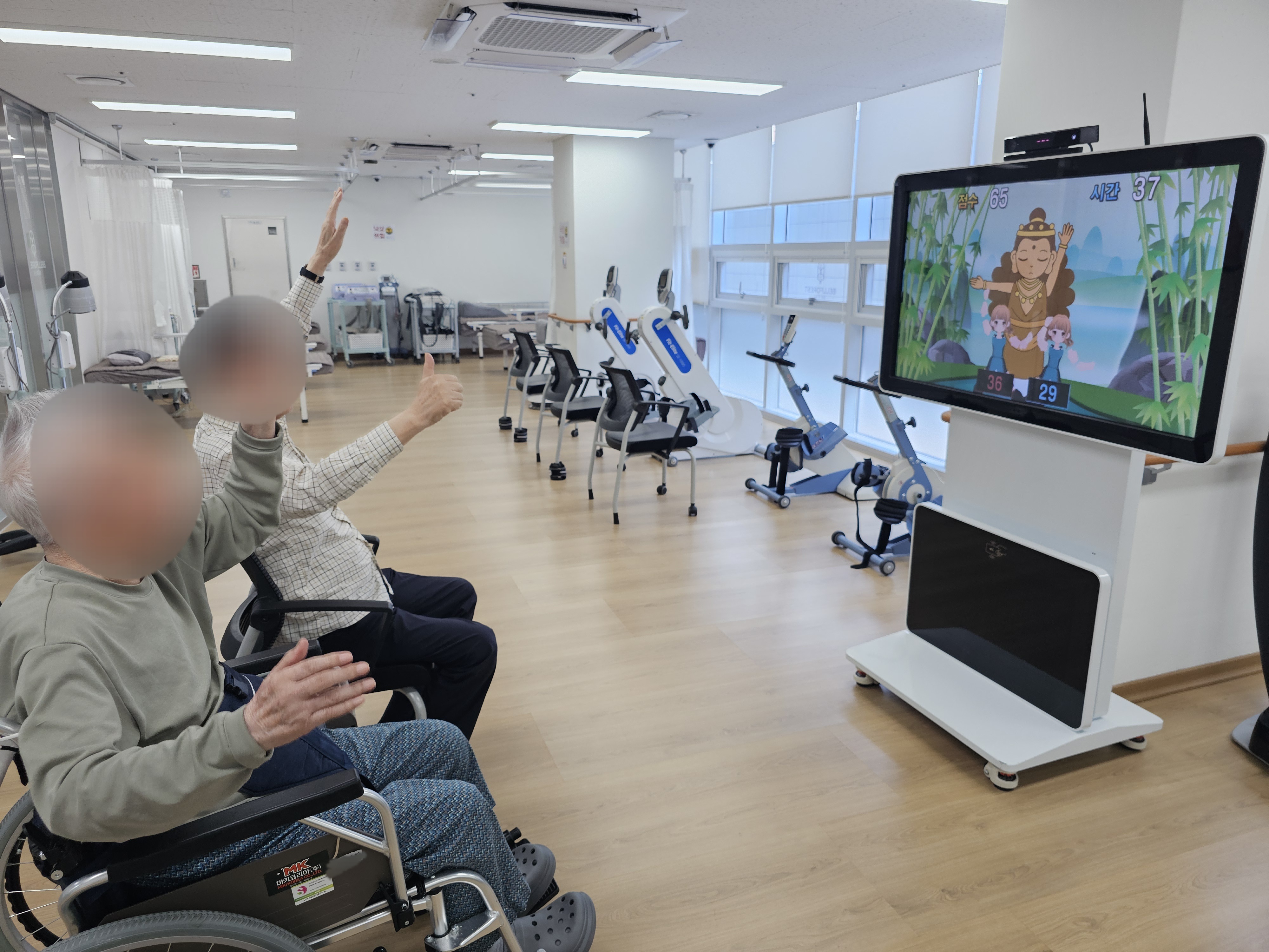 대형 모니터를 통한 3D 동작 감지센서를 통해서 전신에 대한 관절 기울기 측정 및 개인 및 그룹으로 상지, 하지, 균형 훈련이 가능한 전신재활훈련 시스템 입니다.