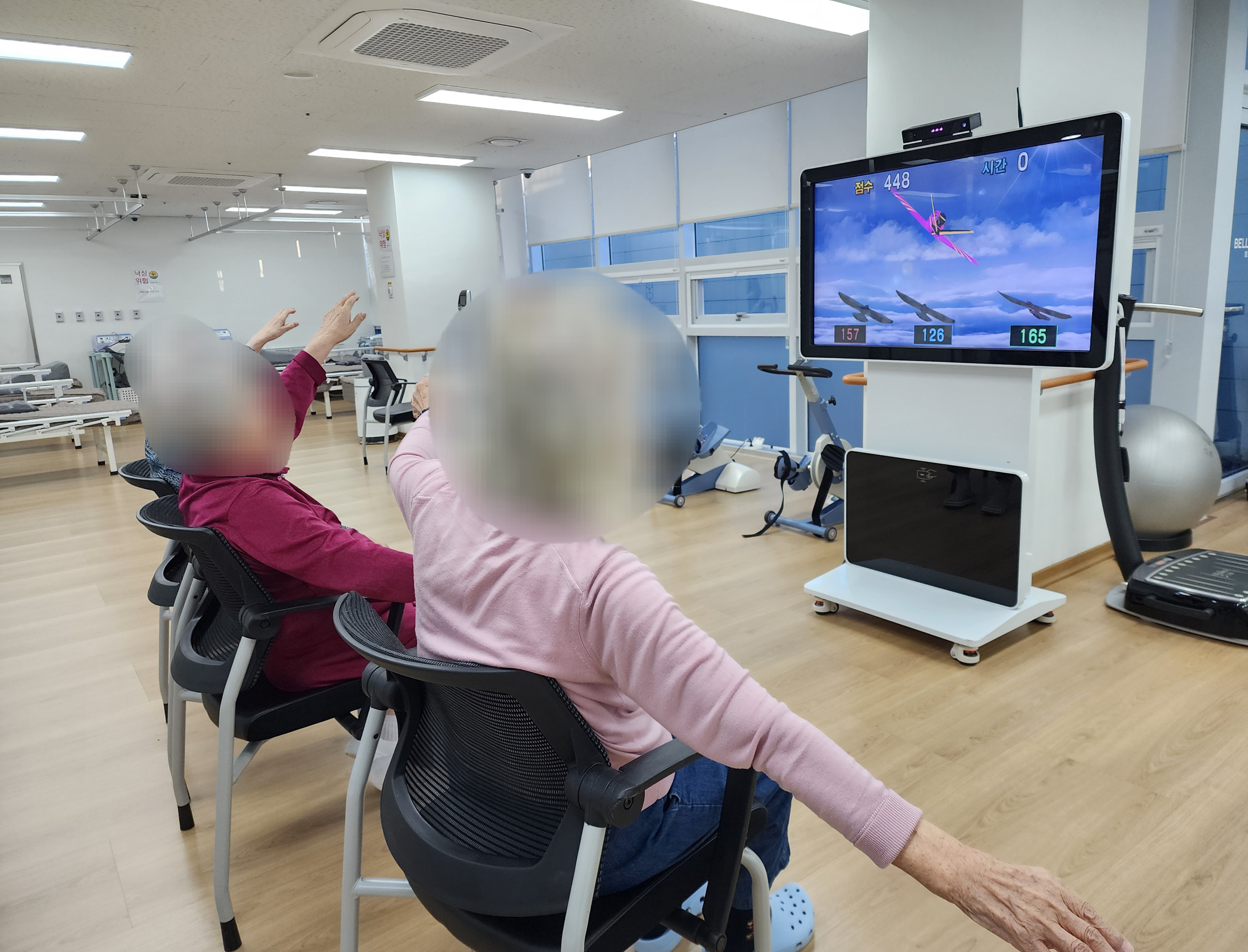 대형 모니터를 통한 3D 동작 감지센서를 통해서 전신에 대한 관절 기울기 측정 및 개인 및 그룹으로 상지하지, 균형 훈련이 가능한 전신재활훈련 시스템 입니다.
