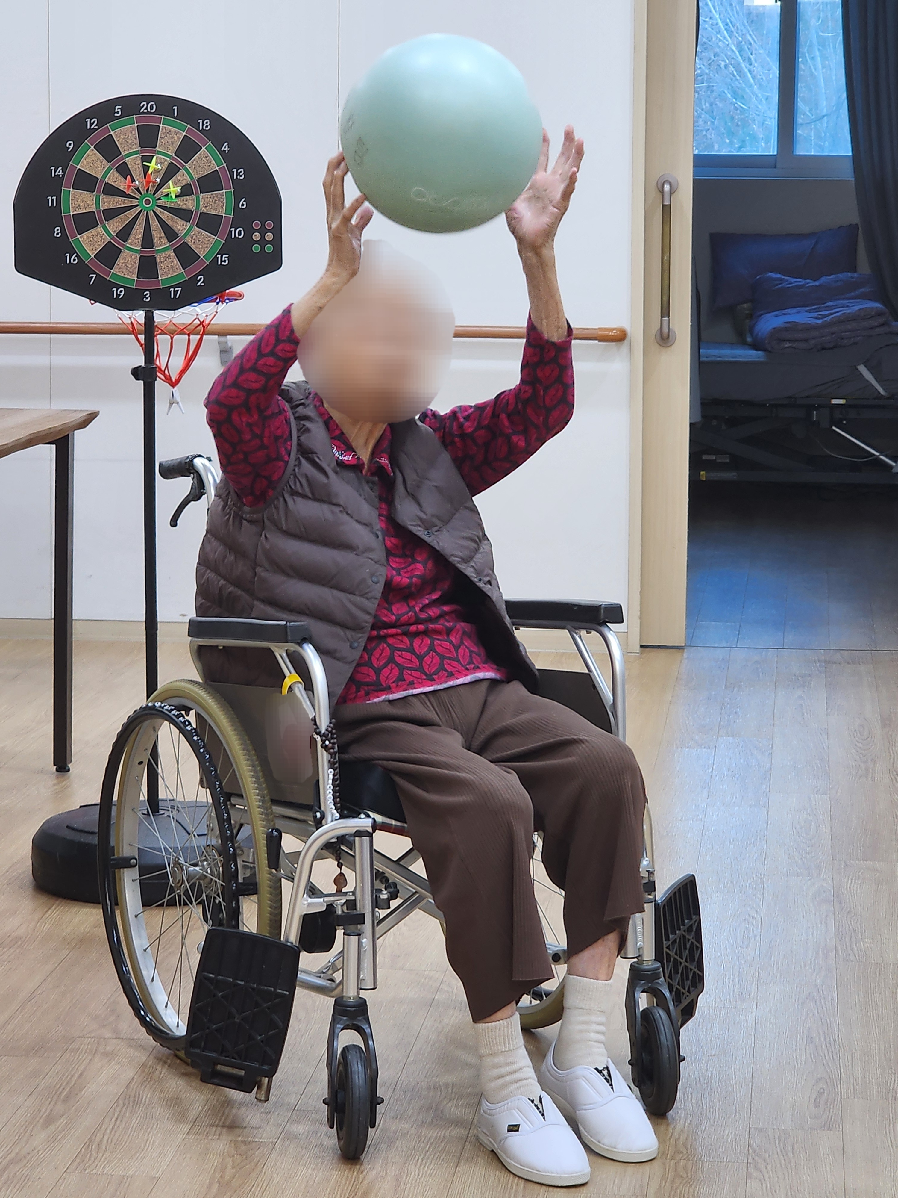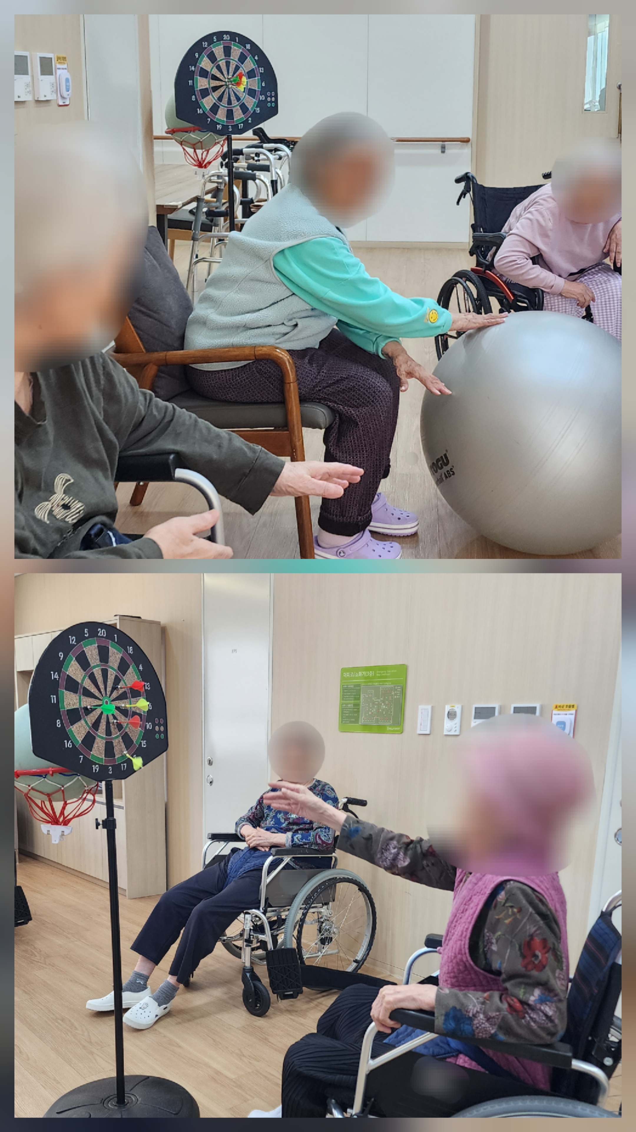 공이 언제 내게 올지 몰라요~“탱탱볼을 서로 주고 받으며, 다트 판에 명중할 때마다 박수도 쳐주며 즐겁게 참여 하셨습니다.