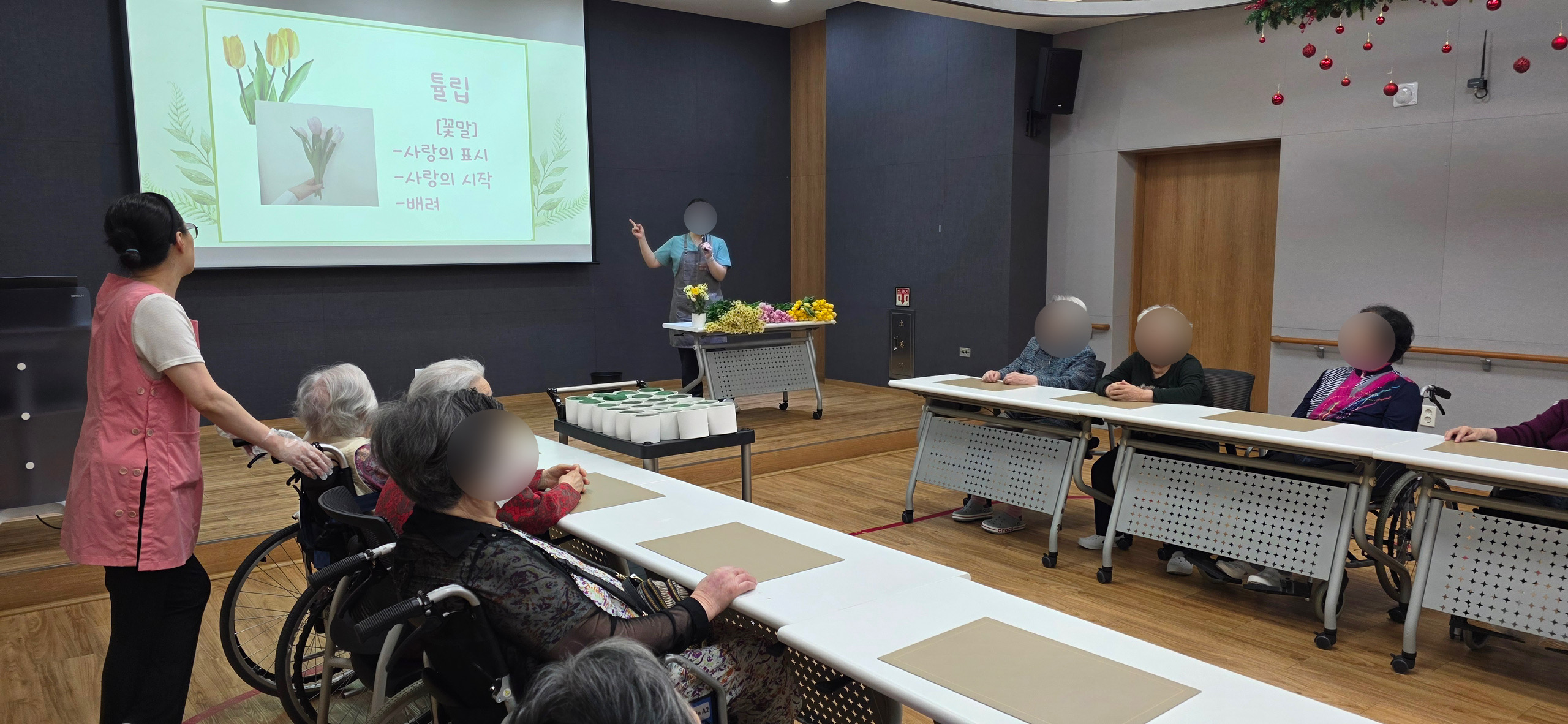 어르신들이 함께 모여 꽃의 이름과 꽃말을 배우고, 진행자의 진행에 따라 꽃을 꽂아 화분을 완성하셨습니다.