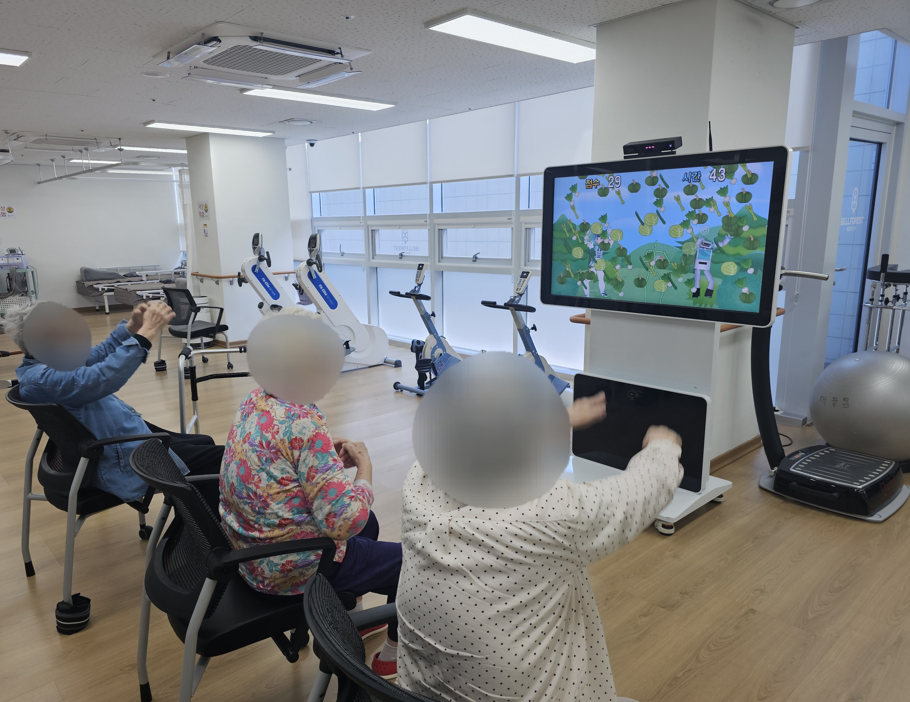 대형 모니터를 통한 3D 동작 감지센서를 통해서 전신에 대한 관절 기울기 측정 및 개인 및 그룹으로 상지, 하지, 균형 훈련이 가능한 전신재활훈련 시스템 입니다.