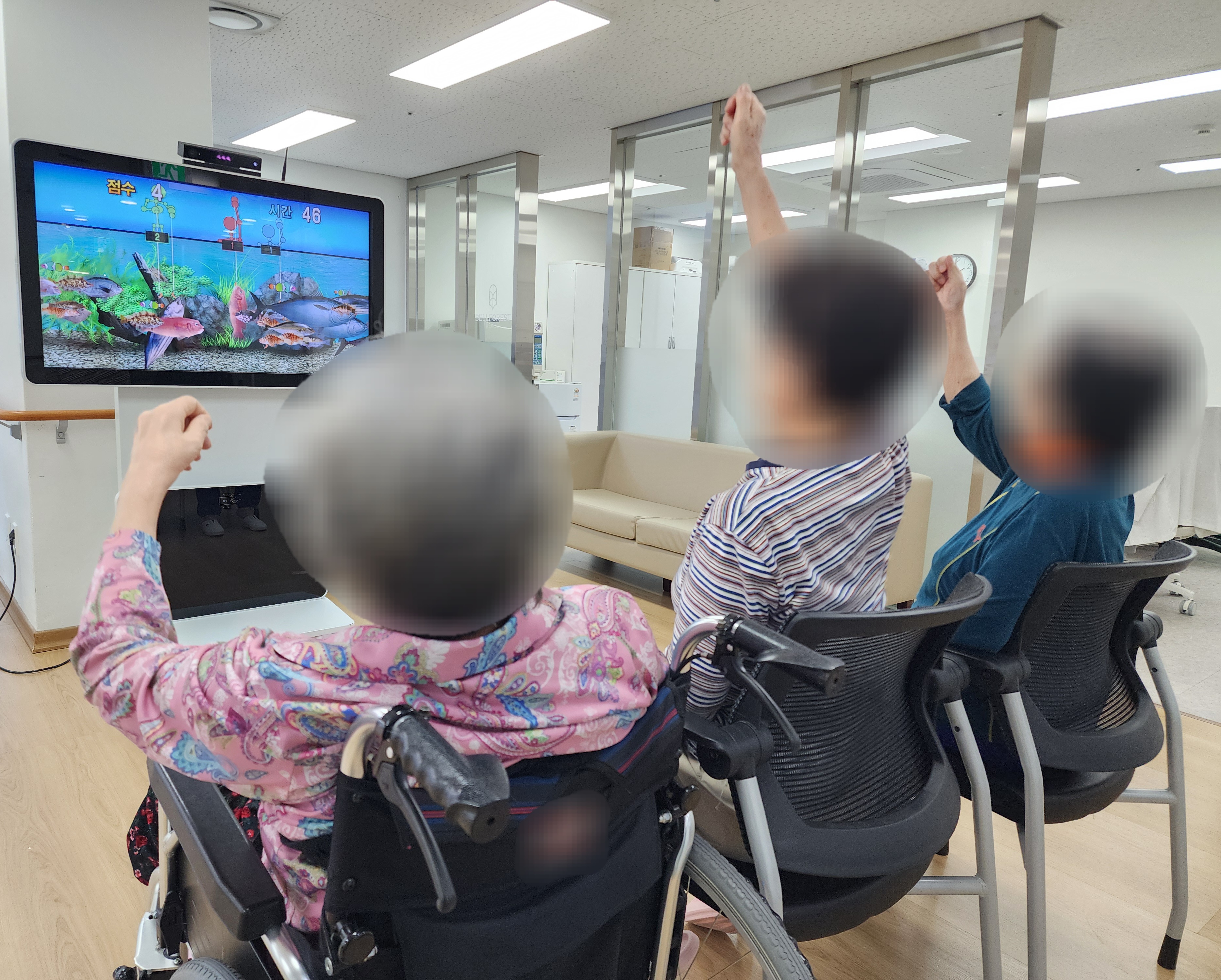 대형 모니터를 통한 3D 동작 감지센서를 통해서 전신에 대한 관절 기울기 측정 및 개인 및 그룹으로 상지, 하지, 균형 훈련이 가능한 전신 재활 훈련 시스템 입니다.